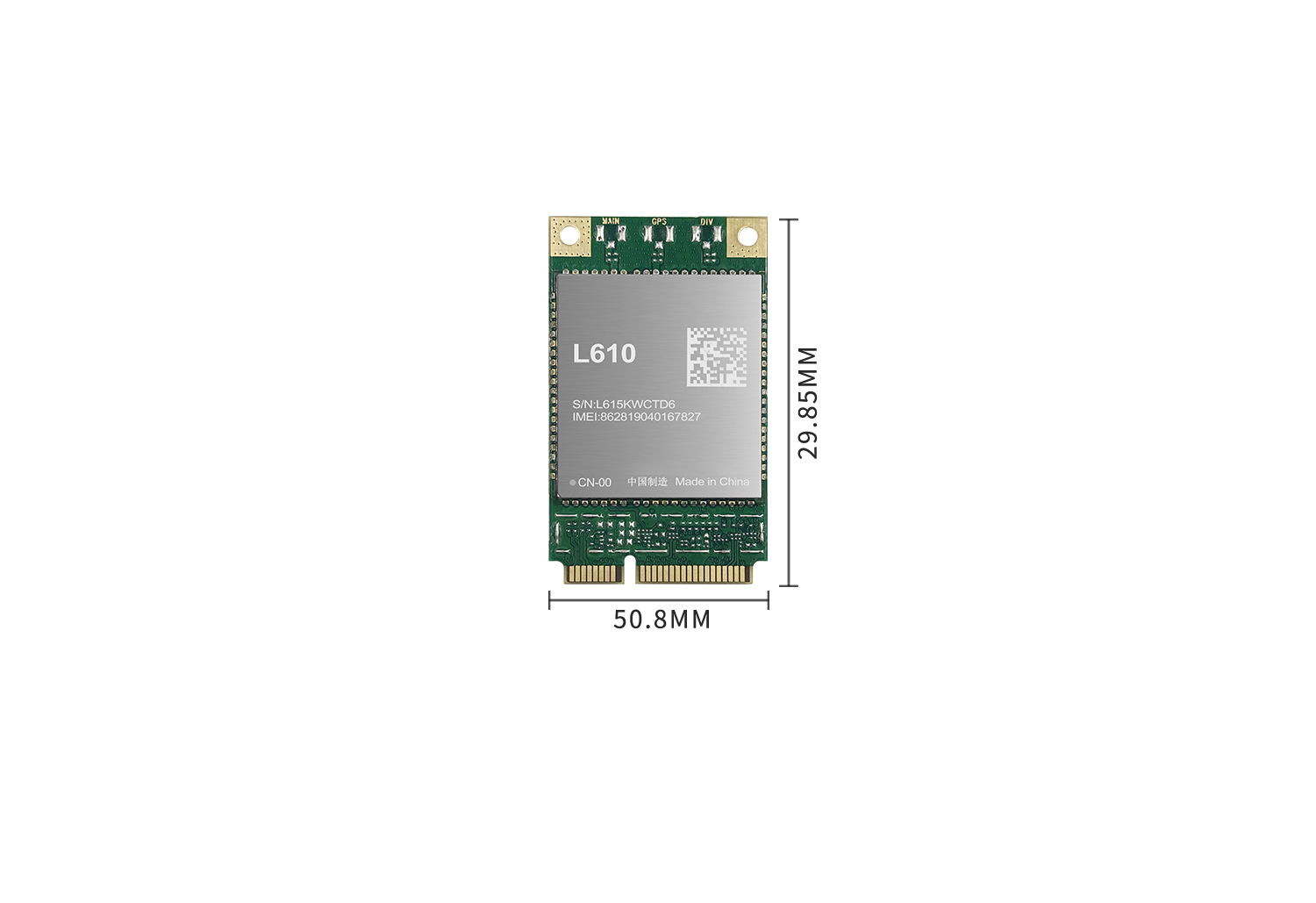 CAT1模組:L610-CN MiniPCIe(LTE: B1/3/5/8/34/38/39/40/41) L610-CN MiniPCIe系列產品是一款LTECat1 bis無線通信模組,采用MiniPCIe封裝,面向亞洲地區主要運營商頻段,另有同系列相同封裝產品L610-EUMiniPCIe、L610-LAMiniPCIe分別針對歐洲、拉美地區主要運營商頻段。 more >